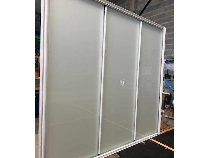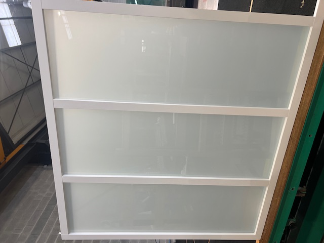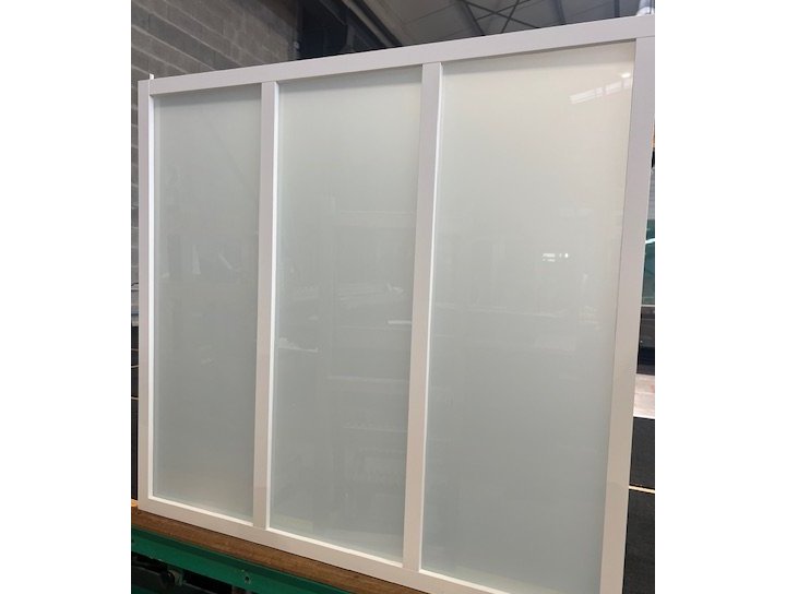En verre feuilleté 33² ou 44² clair ou opale si vous souhaitez garder de l’intimité entre 2 pièces et en ayant une sécurité en cas d’incident.
